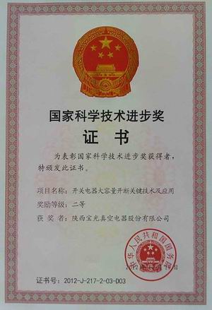 2013年1月18日,在國家科學(xué)技術(shù)大會上,由西安交通大學(xué)、陜西寶光真空電器股份有限公司、常熟開關(guān)制造有限公司、河南平高電器股份有限公司共同完成的《開關(guān)電器大容量開斷關(guān)鍵技術(shù)及應(yīng)用》項(xiàng)目獲得2012年度國家科學(xué)技術(shù)進(jìn)步獎二等獎,西安交通大學(xué)賈申利教授代表項(xiàng)目組到北京參加會議,并領(lǐng)取了國務(wù)院頒發(fā)的獲獎證書。