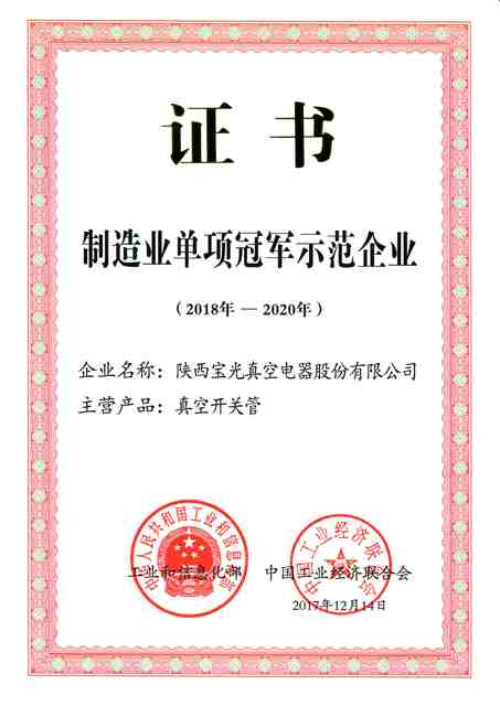 2017年12月工業(yè)和信息化部、中國工業(yè)經(jīng)濟(jì)聯(lián)合會(huì)聯(lián)合公布了第二批制造業(yè)單項(xiàng)冠軍企業(yè)和單項(xiàng)冠軍產(chǎn)品名單,寶光股份作為陜西地區(qū)上榜的唯一一家制造企業(yè),以全球產(chǎn)銷量最大的真空滅弧室制造企業(yè)榮獲“國家第二批制造業(yè)單項(xiàng)冠軍企業(yè)”稱號(hào)。2018年1月22日,由工信部和工業(yè)經(jīng)濟(jì)聯(lián)合會(huì)在北京舉行了頒獎(jiǎng)大會(huì),企業(yè)管理與信息化部部長趙宏參會(huì)并上臺(tái)領(lǐng)獎(jiǎng)。