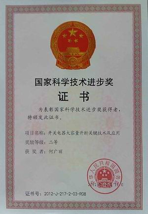 2013年1月18日,在國家科學(xué)技術(shù)大會上,由西安交通大學(xué)、陜西寶光真空電器股份有限公司、常熟開關(guān)制造有限公司、河南平高電器股份有限公司共同完成的《開關(guān)電器大容量開斷關(guān)鍵技術(shù)及應(yīng)用》項(xiàng)目獲得2012年度國家科學(xué)技術(shù)進(jìn)步獎二等獎,西安交通大學(xué)賈申利教授代表項(xiàng)目組到北京參加會議,并領(lǐng)取了國務(wù)院頒發(fā)的獲獎證書。